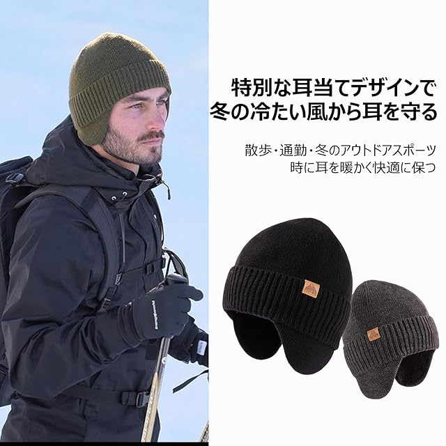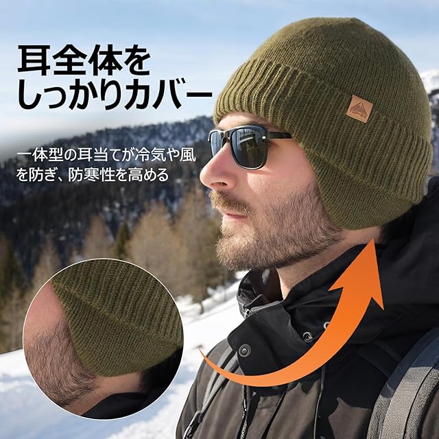 【耳当て付きデザイン】耳当てが一体化したデザインで、耳をしっかりとカバーし、冷たい風から守ります。
