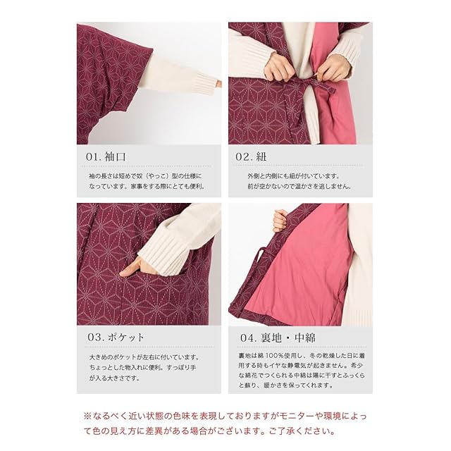 【日本の職人技】 独自の製法によって自社工場でひとつひとつ丁寧に仕上げています。 自社で管理された工場で生産することで安心安全な商品をお届けします。 【素材】 表生地は自社工場で織上げた生地を使っています。 また、中わたについては老舗の布団店で作られており、厳選した素材を利用します。 希少性が高い綿わたは化学繊維よりも優れた保温効果があります。 【抜群の保温性】 人体からの体温を繊維に保ち、優れた保温性を発揮します。 寒い日でもしっかりと暖かさを感じられるため、冬の防寒着として快適なアイテムです。 【ふっくら感】 使い込んでふっくら感が失われた際にも、陽に干すことで膨らみが回復します。 ご家庭で洗濯することも可能です。 【信頼性】 染色、織布、整理加工、縫製とを国内の工場にて行っている為、大変優れた品質の製品が出来上がります。 是非、実際にお手に取ってご体感ください。