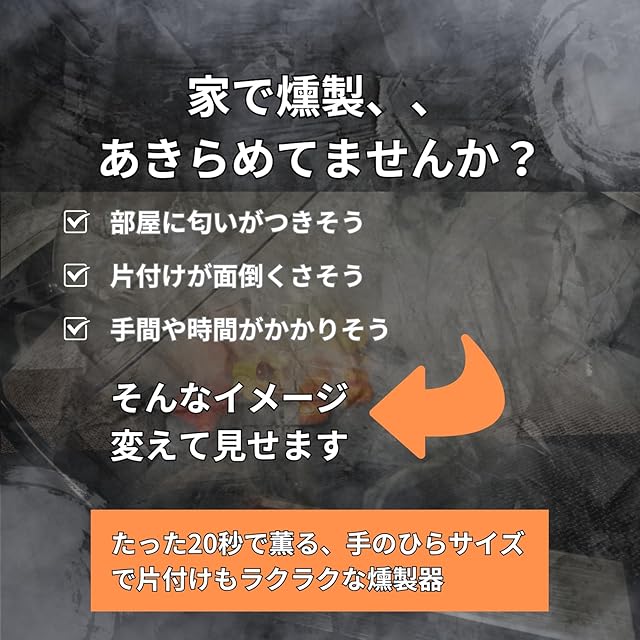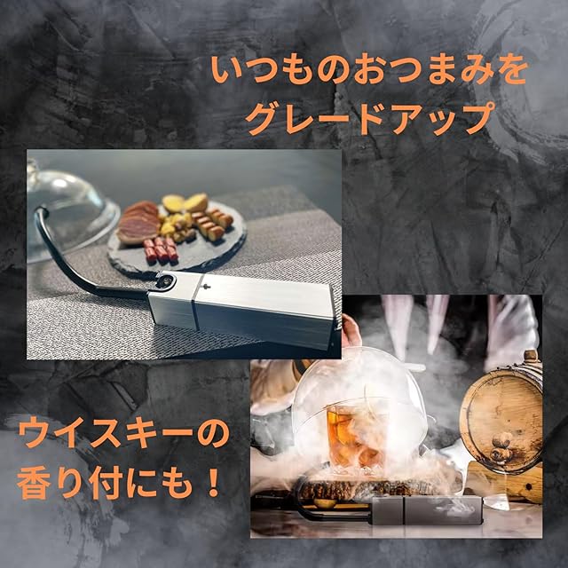 □【たった20秒でこの煙の量!】ナッツや枝豆、鴨肉のローストなど様々な食材を燻製することができます。また、普段のウイスキーやカクテルにも香りをつけることができ、いつもの1杯をグレードアップ!燻製料理はハードルが高い、、そんなことはありません。コンパクトなのに家庭用では十分すぎるくらいの煙の量で本格燻製を楽しみいただけます。本格的な燻製器で作る燻製ももいいですが、少しの時間で気軽に燻製を楽しみたい!そんなあなたにおすすめです。