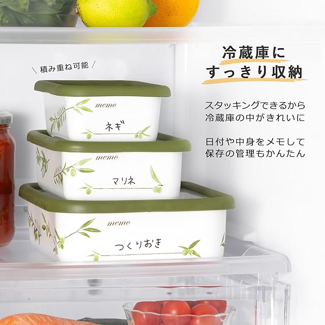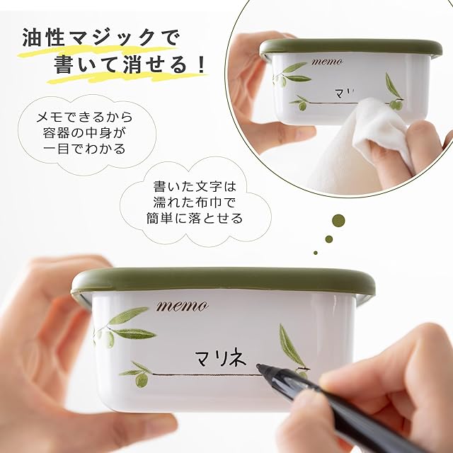 商品名:琺瑯製 保存容器 富士ホーロー 油性ペンで文字を書いて消せるメモ欄付き 深型 S シール蓋付 オリーブ柄