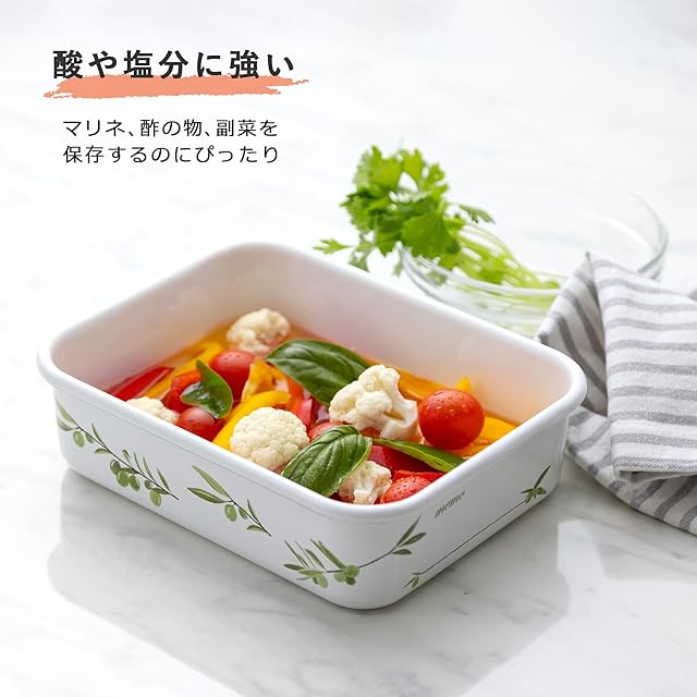 表面はガラス質なので塩分、酸に強く匂いや汚れが付きにくくお手入簡単。マリネ、酢の物、副菜等の保存に向いています。