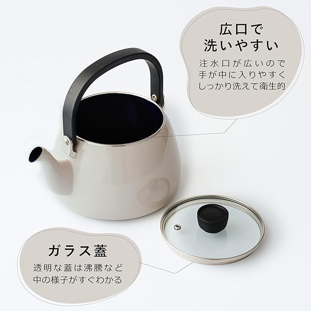 ガラス蓋で中の様子が分かりやすい 広口でお手入れ楽々 ホーロー製 ケトル 2.5L ライトグレー 富士ホーロー IH ガス火 対応