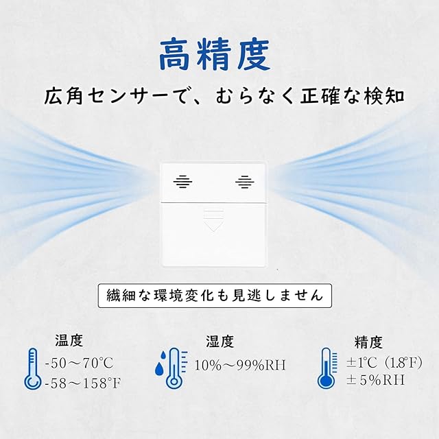 【広範囲・高精度な計測を実現】 高精度センサー搭載で、-50℃~70℃(-58℉~158℉)、湿度10%~90%RHまでの広範囲を正確に計測。温度は±0.1℃、湿度は±5%RHの高精度を実現しました。1秒ごとにデータ更新するので、細かい環境の変化も見逃しません。