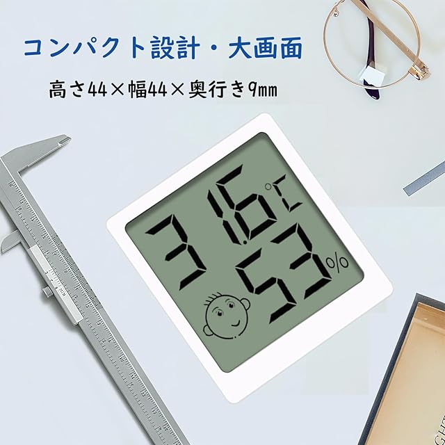 【コンパクト設計と見やすい大画面】 高さ44mm×幅44mm×奥行き9mmのコンパクトサイズ。デスクの隅やベッドサイドなど、ちょとしたスペースにもすっきり収まります。大きな文字で温湿度を表示するLCD画面を採用しているため、離れた場所や斜めからでも数字がくっきりと確認できます。