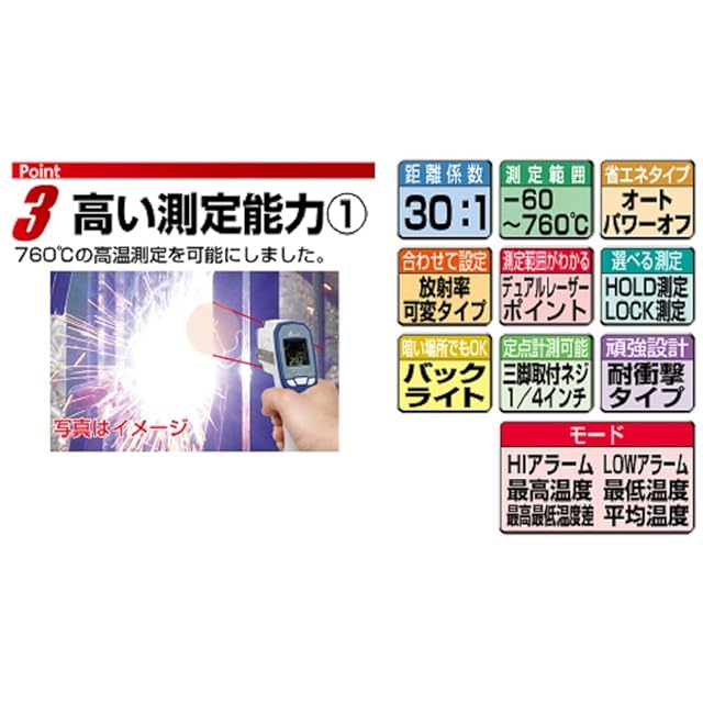精度:0度~760度/プラスマイナス2%またはプラスマイナス2度(数値の大きい方)、-60度~0度/プラスマイナス{-2度+(表示温度×0.05)}度