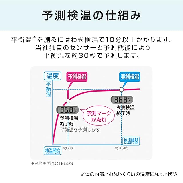 【予測式約30秒+実測式】検温開始後、30秒で予測検温が完了します。そのまま継続して約10分検温すると実測検温も可能です。