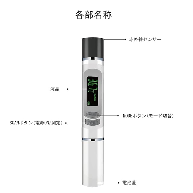 商品名:非接触式電子温度計<br> 温度測定方法:非接触<br> 温度測定精度:±0.2℃ <br>温度測定距離:1~3CM <br>使用環境温度:16℃~35℃・湿度85rh以下 <br>温度値保存数:30件<br> 計測時間2秒以内<br> サイズ:約12.5×1.9cm<br> 重さ:約30g(本体のみ) <br>使用電池:単4乾電池 1本 <p> <br> 注意:<br> ※ご使用する際は新品のアルカリ乾電池でプラス極マイナス極を確認しご使用ください。<br> ※乾電池は別売ですので、別途ご用意ください。<br> ※丸洗いしたり水の掛かる場所では使用しないでください。<br> ※濡れた手で操作をしたり乾電池の交換をしないでください。<br> <br>