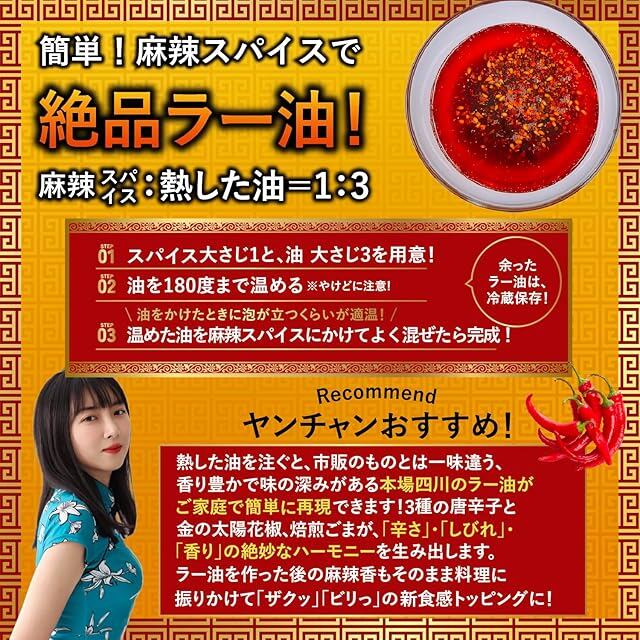 ✅【作るラー油の超簡単レシピ】①本品大さじ1と油大さじ3を用意 ②油を180℃まで温める。 ③温めた油を麻辣香にかけて、よく混ぜたら完成。