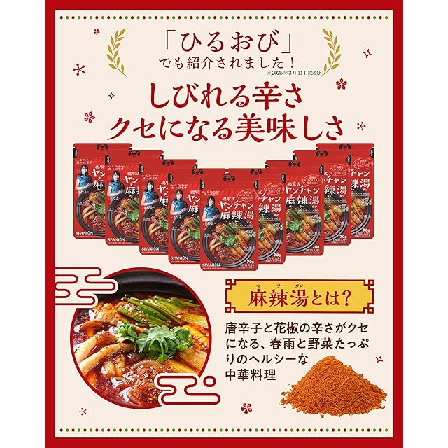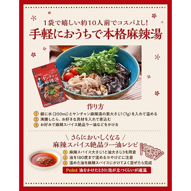 四川省出身YouTuberヤンチャン監修の「麻辣湯」と「麻辣スパイス」のお得なセット!<br>お家で簡単に作れる「麻辣湯の素」に、「麻辣スパイス」で作るラー油をかければ、より刺激的な麻辣湯が完成。<br><br> ・麻辣湯 70g(約1人前×10回分)<br> ・麻辣スパイス 50g<br><br> どちらも、保存に便利なチャック付袋入り!