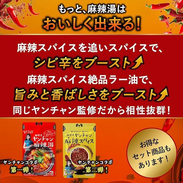 商品名:SPANION 麻辣湯の素 + 麻辣スパイス ヤンチャンコラボお得セット 火鍋の素 麻辣湯 マーラータン 作るラー油の素 万能スパイス シビ辛 麻辣 四川省出身ヤンチャン監修