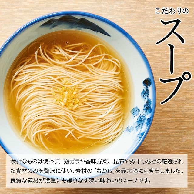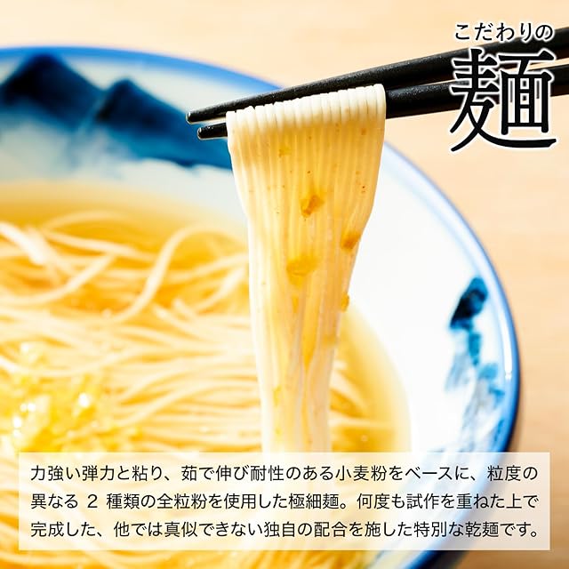 【麺】力強い弾力と粘り、茹で伸び耐性のある小麦粉をベースに、粒度の異なる2種類の全粒粉を使用した極細麺。 何度も試作を重ねた上で完成した、他では真似できない独自の配合を施した特別な乾麺です。 【スープ】化学調味料を使わず、鶏ガラや香味野菜、昆布や煮干しなどの厳選された食材のみを贅沢に使い、素材の「ちから」を最大限に引き出しました。黄金色に澄んでいながらも、良質な素材が幾重にも織りなす深い味わいのスープをお楽しみください。