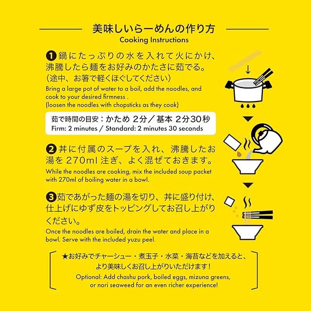 ▼美味しいらーめんの作り方 ①鍋にたっぷりの水を入れて火にかけ、沸騰したら麺を入れ、お好みのかたさに茹でてください。(途中、お箸でほぐしてください) かため:2分/基本:2分30秒 ②丼に付属のスープを入れ、沸騰したお湯を270ml注ぎ、よく混ぜておきます。 ③麺が茹であがりましたら、ザルなどで湯切りし、丼に盛り付け、仕上げに柚子皮をトッピングしてお召し上がりください。 ★お好みでチャーシューや煮玉子、水菜、海苔などを加えると、より美味しくお召し上がりいただけます!
