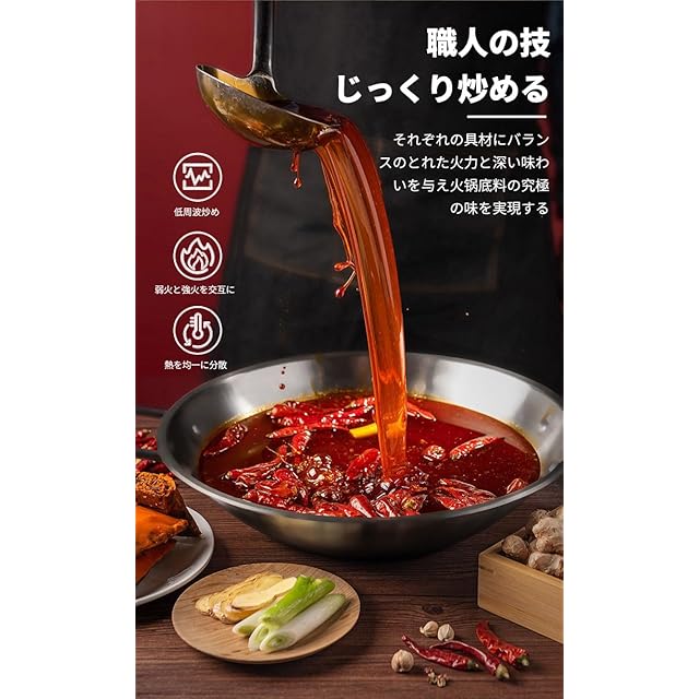【職人の技】私たちは100年の職人技を受け継ぎ、スパイスひとつひとつが完全に溶け込むよう、大小の炎を交互に使いながらじっくりと煮込む製法を用いています。この職人技による煮込みは、スパイスの香りを引き立たせるだけでなく、素材本来の味を大切にします。火加減とスパイスの比率を緻密にコントロールすることで、鍋の素1包1包が四川火鍋の真髄を完璧に引き出しているのです。
