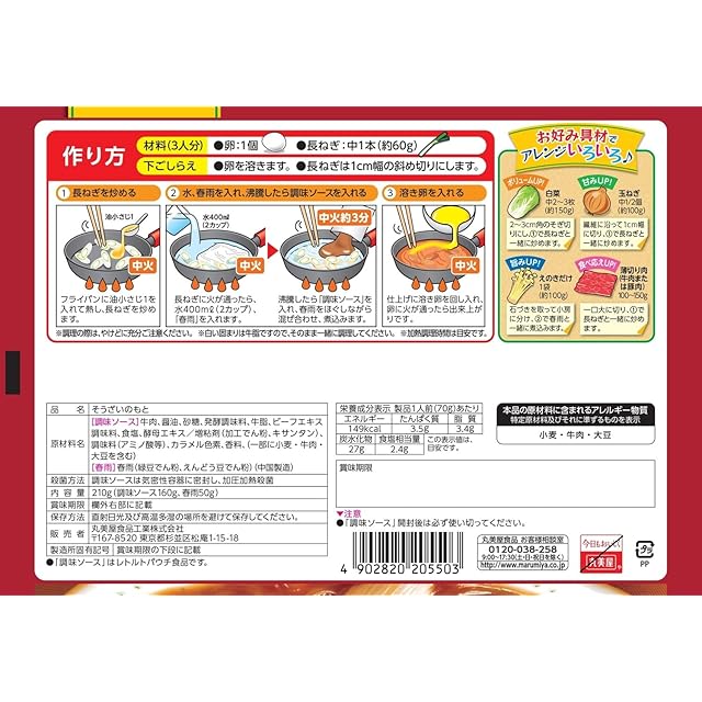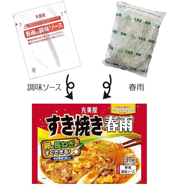 原材料:[調味ソース]牛肉、醤油、砂糖、発酵調味料、牛脂、ビーフエキス調味料、食塩、酵母エキス/増粘剤(加工でん粉、キサンタン)、調味料(アミノ酸等)、カラメル色素、香料、(一部に小麦・牛肉・大豆を含む)| [春雨]春雨(緑豆でん粉、えんどう豆でん粉)(中国製造)