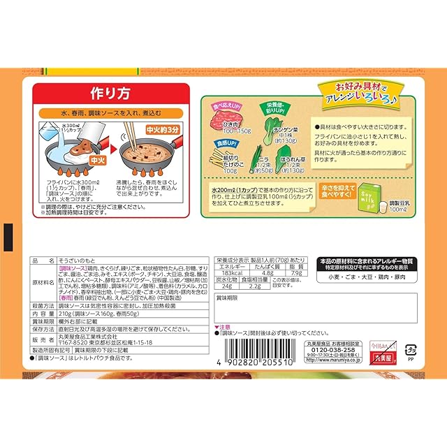 原材料:[調味ソース]鶏肉、きくらげ、練りごま、粒状植物性たん白、砂糖、すりごま、醤油、ごま油、みそ、エキス(ポーク、チキン)、大豆油、食塩、醸造酢、にんにくペースト、酵母エキスパウダー、豆板醤、山椒/増粘剤(加工でん粉、増粘多糖類)、調味料(アミノ酸等)、着色料(カラメル、カロチノイド)、香辛料抽出物、(一部に小麦・ごま・大豆・鶏肉・豚肉を含む)| [春雨]春雨(緑豆でん粉、えんどう豆でん粉)(中国製造)