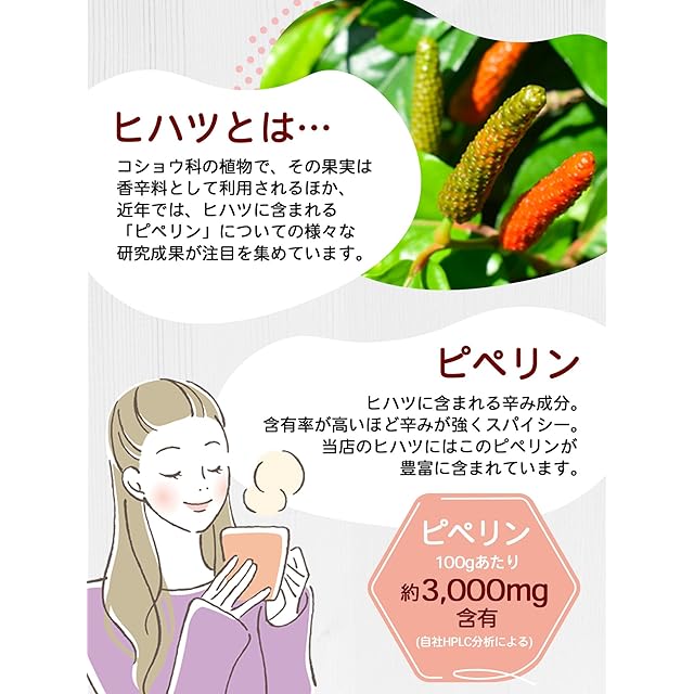 ✅【ヒハツとは】コショウ科の植物で、その果実は香辛料として利用されるほか、近年では、ヒハツに含まれる「ピぺリン」についての様々な研究成果が注目を集めています。シナモンのような甘い香りとコショウのようなピリッとした辛さが特徴です。