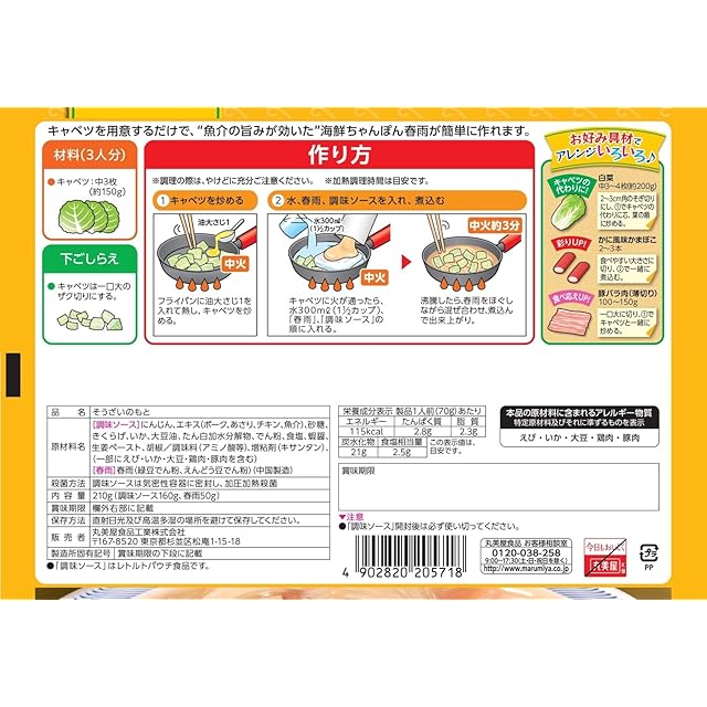 原材料:[調味ソース]にんじん、エキス(ポーク、あさり、チキン、魚介)、砂糖、きくらげ、いか、大豆油、たん白加水分解物、でん粉、食塩、蝦醤、生姜ペースト、胡椒/調味料(アミノ酸等)、増粘剤(キサンタン)、(一部にえび・いか・大豆・鶏肉・豚肉を含む)| [春雨]春雨(緑豆でん粉、えんどう豆でん粉)(中国製造)