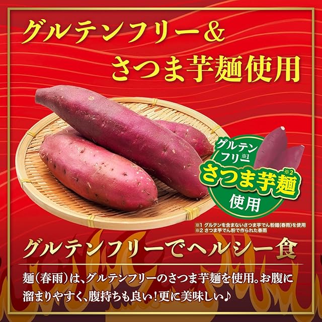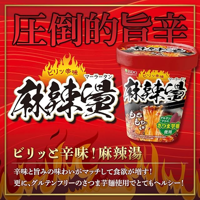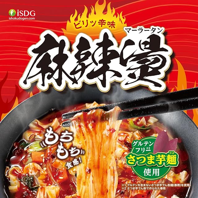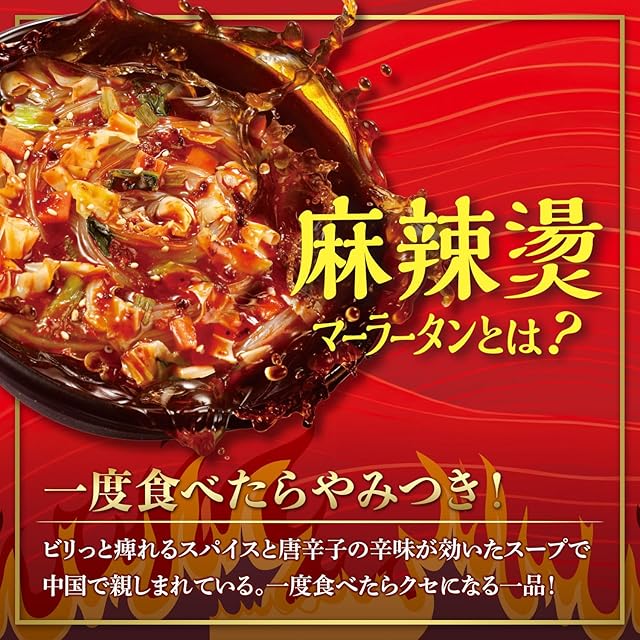 ビリッと辛味!麻辣湯 ・グルテンフリー麺を使用※1 ・もちもち食感のさつまいも麺※2仕様 ※1 グルテンを含まないさつまいも芋でん粉麺(春雨)を使用 ※2 さつま芋でん粉で作られた春雨 ================= さつま芋粉で作られた春雨は、健康的なだけではなく、 スープをよく吸ってくれるのでしっかりした味を楽しめます。 時間が経ってもやわらかくなりすぎず、最後までもちもちの食感を楽しめます。 ================= ●麻辣湯とは? ビリっと痺れるスパイスと唐辛子の辛味が効いたスープで、中国で親しまれている一度食べたらクセになる一品です。
