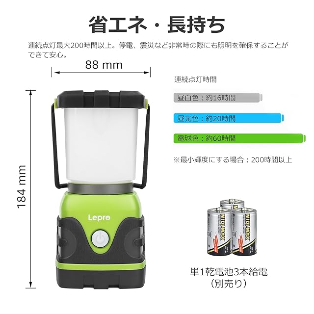超高輝度・明るさは最大1500ルーメンです。且つ目にも大変優しいです。・点灯時間は、20時間→60時間→16時間の順に点灯。様々な場面で活躍可能。調光&調色・4つの点灯モードを搭載しています。900ルーメン(昼光色)・350ルーメン(電球色)・1500ルーメン(昼白色)・赤光(フラッシュ)と調節ができます。・スイッチで場面に応じて無限に調色もできます。防水 ・防水性能IPX4です。・底にある収納式のフックカバーを外して逆さに吊り下げることもできます。 ・また、サイズは95mm×88mm×184mm、重量は400gです。便利・単一電池3本(別売り)使用の電池式です。 ・持ち運びに便利で、キャンプ・釣り・ハイキング・仕事・散歩等様々な場所に適しています。