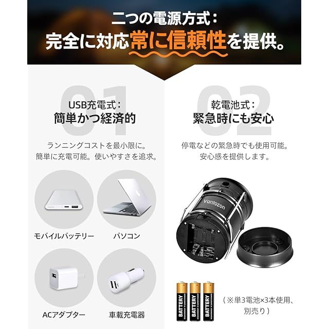 【二重電源方式・USB充電式&電池式】USB充電式と電池式の二つの電源方式を採用したこの ランタン なら、長時間のアウトドア活動や突発的な停電にも柔軟に対応します。どんな状況でも信頼性の高い明るさを提供し、安心感をもたらす 充電式ランタン & 電池式ランタン です。