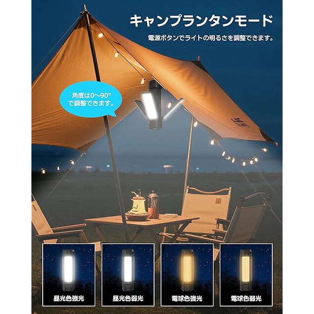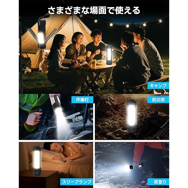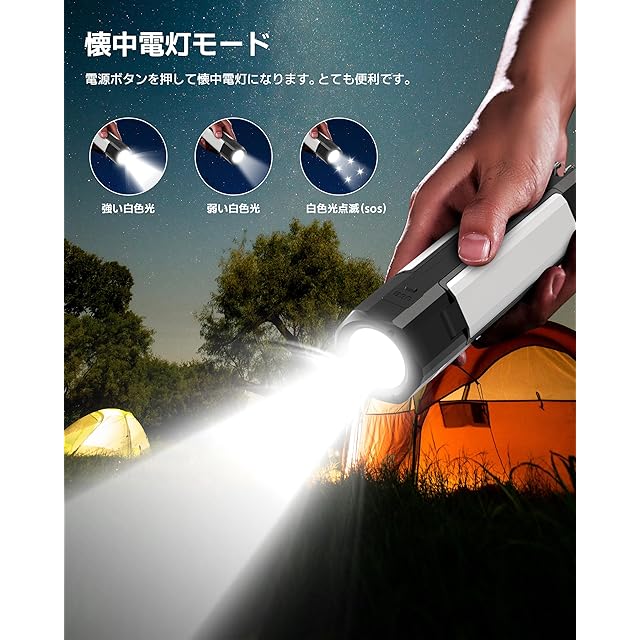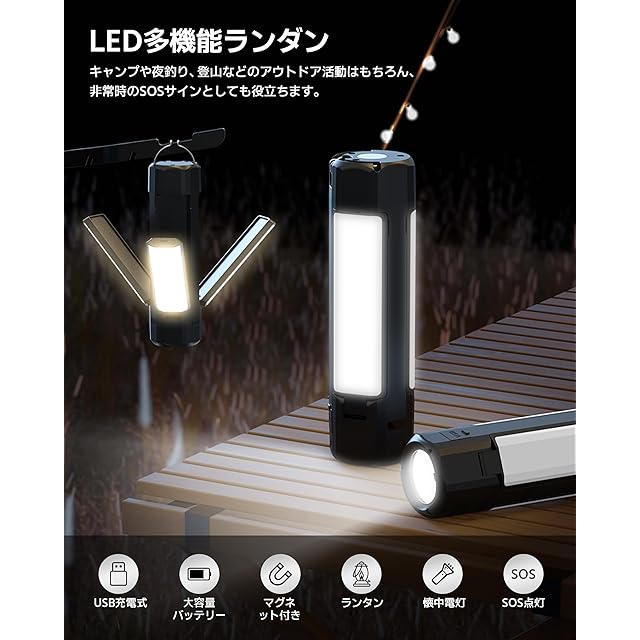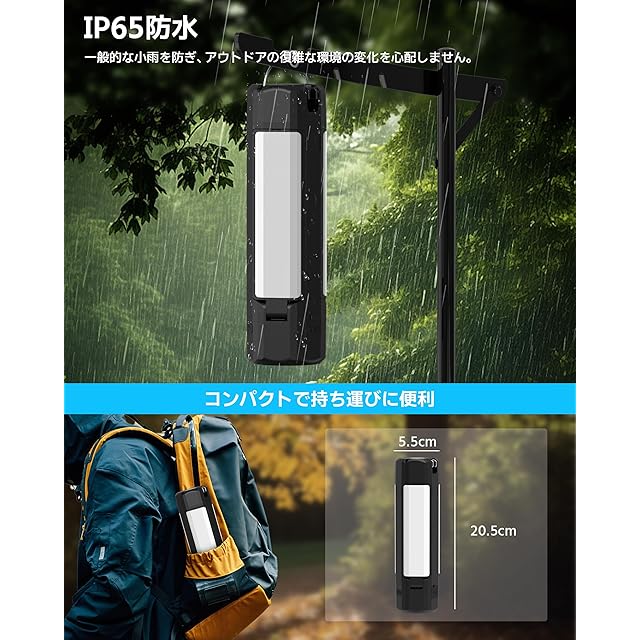 【さまざまな場面で使える】吊り下げ、手持ち、マグネット固定など、場面に応じた多様な設置方法が可能な 防災ランタンです。サイズは5.5*20.5CM,重さは約320gです。キャンプライト用途以外に、懐中電灯としても使用できるため、遠くまで照射し、復雑なアウトドア環境にも対応できる。緊急時にはSOSライトとしても使えるので、アウトドアでの活働にこのランタンがひとつあると安心な存在です!万が一停電の時、電池を備えてあれば長時間の連続照明が可能で、防災ランタンとしても重宝なアイテムです。