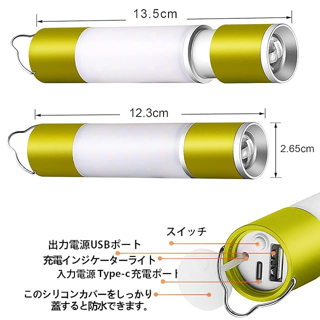 【Type-C充電式双方向& アウトドア用ライト】2600mAh充電式のリチウムバッテリーが内臓、付属のType-Cケーブルで直接に充電することができます。ユニークな充電デザイン、USBポートを水埃から守ります。緊急の場合モバイル電源としても使用できます、 は携帯電話や他の電子機器の充電ができます。
