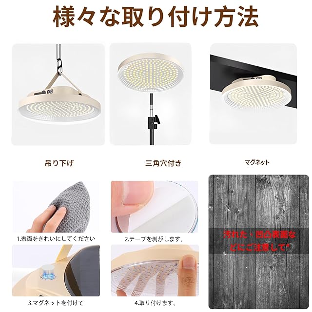【強力マグネット・フック付き・工事不要/取り付け簡単】:ledランタンは、強力マグネットで金属面に直接に貼り付けます。金属のない場所に、付属の粘着金属プレートを利用して貼り付けます。 滑らかな表面ならどこにでも貼ったり、金属表面ならどこでも簡単に吸着できます。好きな場所に工事不要に装着できます。配線が不要で、取り付け/取り外しが簡単です。また、吊り下げフックも付いて、テントランタンとして引っ掛けて使用可能です。LEDランタンの側面には三脚取付用のネジ穴があり、三脚を使って簡単に固定できます。