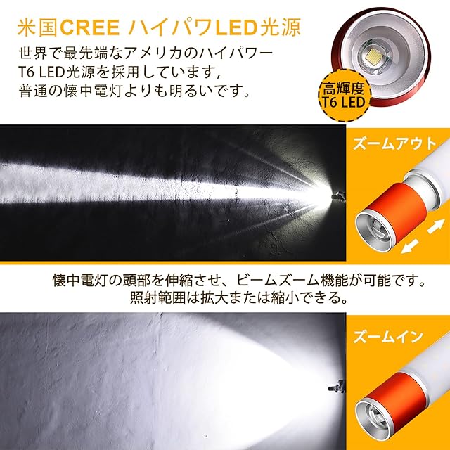 【バージョンアップの6つモード切り替えの伸縮式フォーカス】片手で簡単にスイッチを制御できて、初心者でもストレス無く快適にご使用いただけます。1回押すと点灯し、6つの照明モード(懐中電灯高輝度 → 懐中電灯低輝度 → ランタン昼白色高輝度 →ランタン昼白色低輝度 → ランタン電気色高輝度 → ランタン電気色低輝度→off)をすばやく切り替えることができます。伸縮式ズームレンズなので、照射範囲を広げたり、狭めたりすることができます。素早く消灯機能を特別に追加しました 。 どのモードでも10秒以上維持したら、スイッチに触れるだけでライトをすばやく消灯できます、電源を3秒長押して消灯します。周期的な切り替えは不要です。