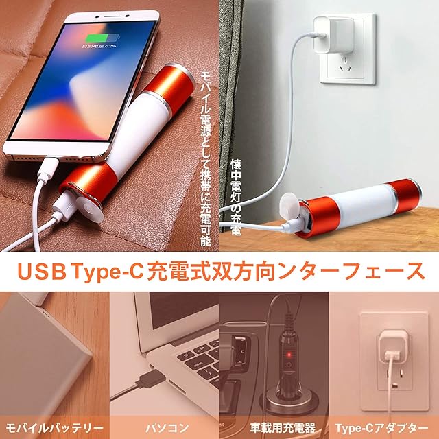 【USB Type-C充電式双方向& アウトドア用ライト】2600mAh充電式のリチウムバッテリーが内臓、付属のUSB Type-C ケーブルで直接に充電することができます。ユニークな充電デザイン、USBポートを水埃から守ります。緊急の場合モバイル電源としても使用できます、 は携帯電話や他の電子機器の充電ができます。