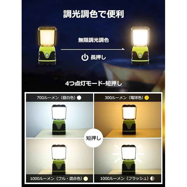【4つの点灯モード・無段階調光調色】ランタンは700ルーメン(昼白色)・300ルーメン(電球色)・1000 ルーメン(フル・混合色)・1000ルーメン(フラッシュ)の4モードを選択可能で、スイッチを長押しすることによ り無段階調光調色もでき、ご利用シーンに応じて自由に設置できます。キャンプランタンとして大活躍。