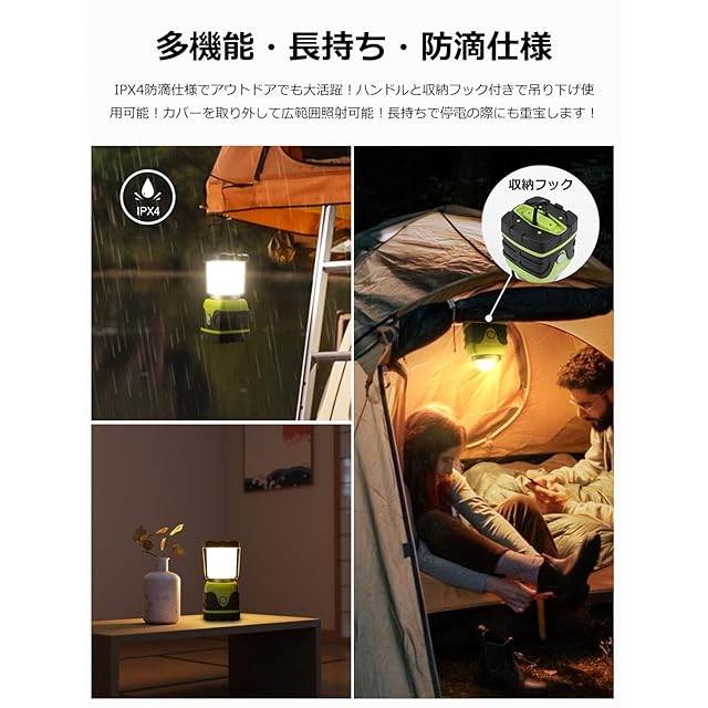 【防滴・耐久】ランタンの防水性能はIPX4で、いかなる角度からの水しぶきにも耐えられます。耐衝撃性・耐熱性・耐磨耗性に強く、悪天候にあっても心配することなく、優れた耐久性を実現します(ご注意:生活防水のため、大雨天気の使用をお控えください。)